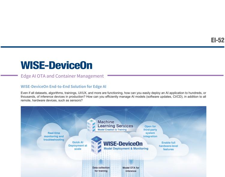 - 研华EI-52,边缘计算系统,支持 Intel 11th gen CPU,可选 Core i5 /i3 /Celeron 处理器,采用全新设计,具备丰富扩展接口 2 x LAN,2 x COM,6 x USB等,内部可以通过 miniPCIe 或 M.2 扩展AI加速卡实现工业AI机器视觉,搭载5G通讯模块,可以满足5G+边缘计算。适用于智慧城市、智慧工厂、智慧矿山等具有5G通讯需求的应用场景,可以根据现场应用需求,灵活定制具体配置。采用全新的设计语言,白色外观,更小巧的机身具备更强悍的性能,带有用于数据采集的软件 Edge X API,用于设备管理和远程控制WISE-DeviceOn。
