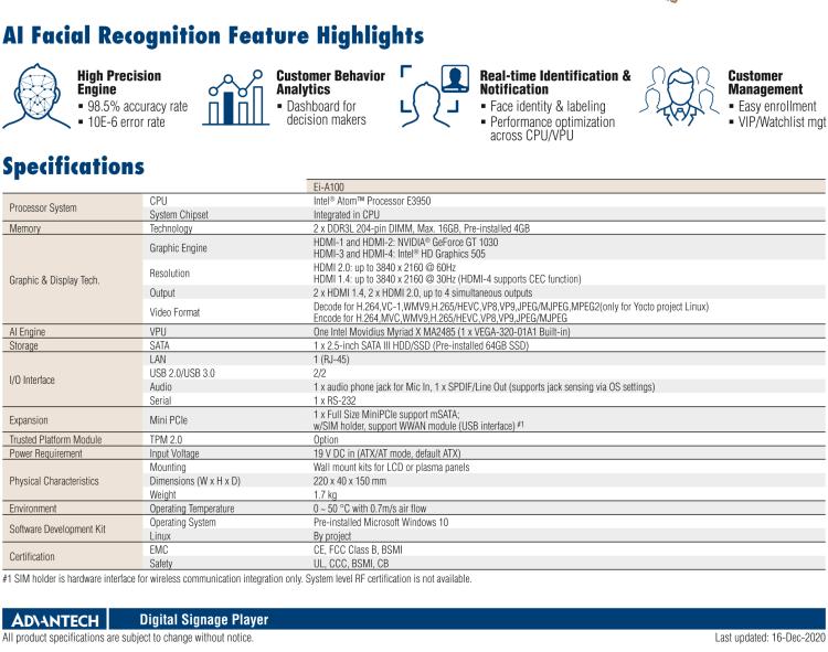 研华Ei-A100 4K Digital Signage Player with One Intel Movidius VPU for AI Facial Recognition