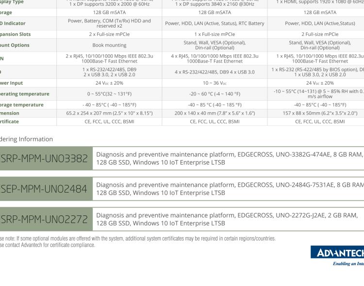 研华ESRP-MPM-UNO3382 Diagnosis and preventive maintenance platform, EDGECROSS, UNO-3382G-474AE, 8 GB RAM, 64 GB SSD, Windows 10 IoT Enterprise LTSB
