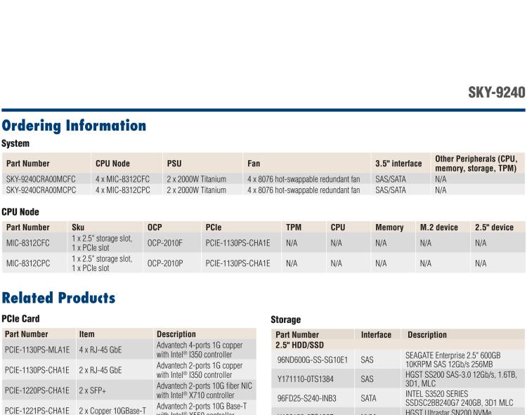 - The SKY-9240 is a 2U 4-node rackmount server designed for hyper-converged infrastructure and high performance compute in markets demanding enhanced solutions for applications such as hyper-converged secondary storage, object recognition and deep-learning, virtual desktop infrastructure and compute intensive cloud. The system delivers the highest performance and efficiency in a 2U 4-node design, creating the flexibility to deploy independent workloads with all the economies of a shared chassis infrastructure, including cooling and power. This significantly lowers the total cost of ownership (TCO) to less than the cost of four regular 1U or 2U servers. The hot-swappable compute nodes are designed with dual Intel® Xeon® Scalable processors and the latest DDR4 memory technology. Each node supports up to two 28-core CPUs with an increased UPI bandwidth of 10.4GT/s, nearly 10% improvement from the previous generation, lowering latency and accelerating inter-processor communications. In addition, a 6-channel memory design increases memory bandwidth by up to 50% and supports up to 512GB RAM per node. The compute nodes employ an innovative and modular design concept for maximum configuration flexibility in a space-efficient form-factor. One OCP mezzanine slot and up to two PCIe slots per node enable a broader choice of I/O, offload and acceleration than similar designs. Each computes node provides 2.5" data storage capabilities with a further twelve 3.5" SAS/SATA drive bays available at chassis level for optional cold data storage. Redundant, hotswappable 1 1 power and fans enhance product stability and serviceability, maximizing availability and increasing uptime. The system offers enhanced platforms management capabilities and supports the latest major Linux distributions including CentOS, Red Hat Enterprise Linux, Ubuntu, and VMware.