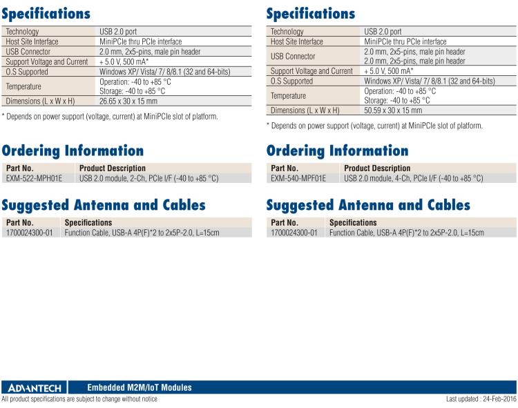 - 研华 EXM-522 模块属于 PCIe 转 2 路 USB 2.0 接口设备。EXM-522 模块可便捷地将 2 个 USB 2.0 设备转为 1 个流行 PCIe x 1 端口。主要通过集成工业级 PCIe 桥芯片实现。 EXM-522 模块兼容所有类型 USB 设备,包括硬盘 (HDD)、固态磁盘 (SSD) 和光驱 (CD/DVD/BD)。这是一款适合于存储应用的通用解决方案。