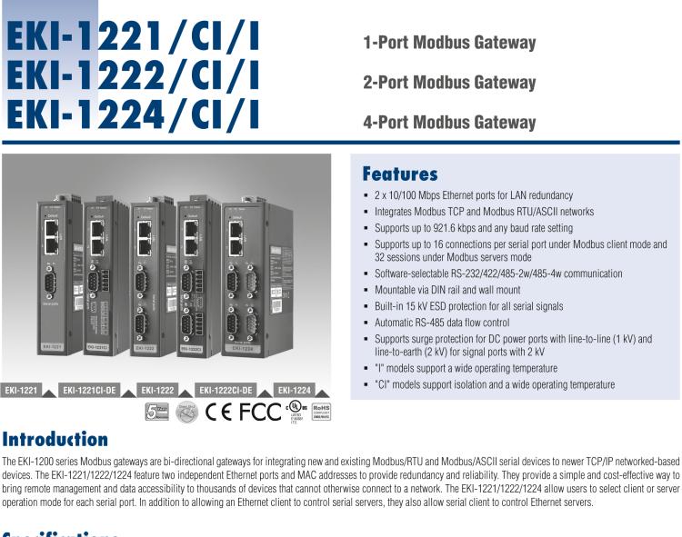 - EKI-1220系列串口Modbus数据网关是将现有的和新的Modbus/RTU及Modbus/ASCII 串口设备集成到较新的TCP/IP网络上的双向网关。EKI-1221/1222/1224的特点是拥有两个独立的以太网口和MAC地址,提供了一个冗余的网络机制,以保证以太网的可靠性。EKI-1221/1222/1224提供了一个快速、便捷、高性价比的解决方案,能够让数以千计的无法联网的串行设备实现远程管理和设备数据共享。EKI-1221/1222/1224支持用户为每个串行端口选择主从运行模式,不但