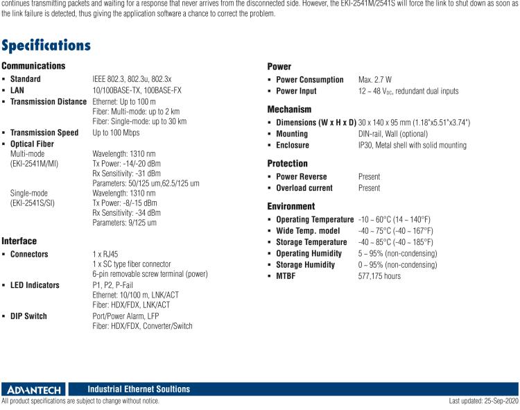 - EKI-2541M/2541S以太网光电转换器能够很容易的将以太网信号转换为光信号,利用它可以发挥光纤宽大、防电磁干扰及传输距离远的优势,因此EKI-2541M是“光纤入户”的理想解决方案,应用于中控室连接与现场。 EKI-2541M/2541S支持MDI/MDIX自动检测,因此您无需再使用交叉线缆。同时其内含的交还控制器也能够自适应10/100Mbps的传输速度。设备的以太网口及光纤口都有自己的缓存,支持“存储转发”机制,能够确保数据的完整传输。