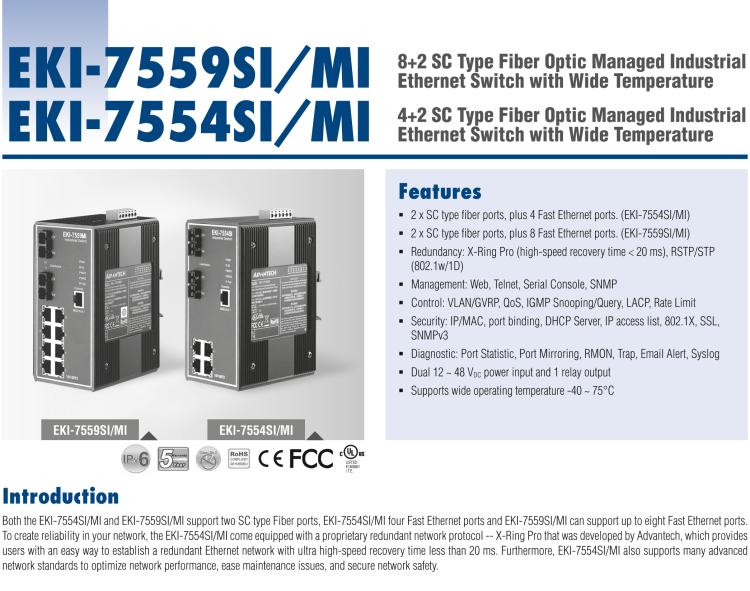 - EKI-7559SI支持2个SC型光纤端口,此外还支持最多8个快速以太网端口。为了确保网络的可靠性,EKI-7559sI支持研华X-ring冗余网络协议,让使用者非常方便的建立冗余以太网络,该网络具备小于10ms的超高速自愈时间。此外,EKI-7559SI还支持多种先进的网络标准,增强网络的安全性,简化维护程序。