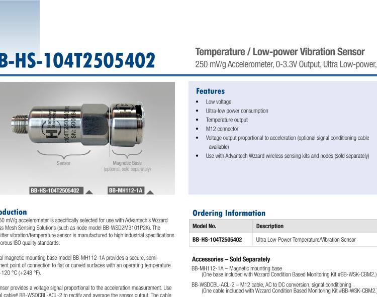 - Model BB-WSDCBL-ACL-2 accessory/replacement cable converts AC to DC. M12, 2-meter cable connects Wzzard industrial node# BB-WSD2M3101P2K) to accelerometer sensor# BB-HS-104T2505402 and provides signal conditioning for the sensor. One cable is included w/ Wzzard Condition Based Monitoring Kit.