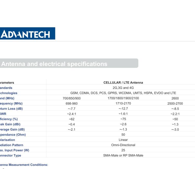 - Frequency range 698-960 MHz, 1710-2170 MHz, 2500-2700 MHz