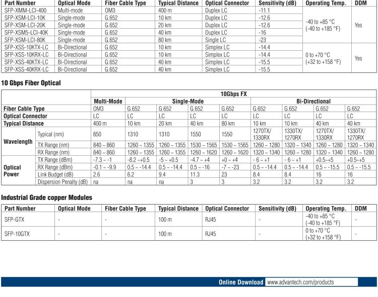 - 研华小型可插拔(SFP)收发器系列可用于各种类型的铜质SFP和光纤SFP、SFP和XFP。此收发器模块符合小型可插拔(SFP)多源协议(MSA)。它们具有热插拔特性,易于交换光学类型、覆盖范围和现场可替换性,因此用途广泛。研华SFP提供强大的工业性能和支持宽温工作同时,通过实时监测,DDM(digital diagnostic monitoring)功能为用户提供接收光功率、发射光功率、激光偏置电流、输入电压、网络温度等关键信息。这种方法无疑是一种较好的故障隔离和错误检测方法。