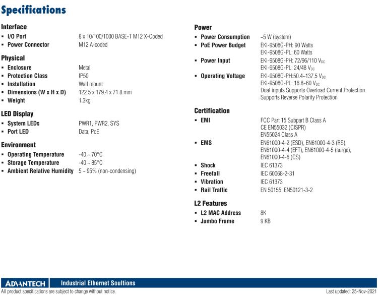 - The EKI-9500 series switch is designed for railway application with rugged and high EMC performance and is suitable for networking solution for rolling stock and wayside applications. The EKI-9500 series provides M12 connectors for Ethernet/ console/ relay/ power-input connections to ensure tight & robust connectivity, so as to guarantee reliable operation against environmental disturbances such as vibration and shock on train. The EKI-9508G-PH & EKI-9508G-PL are PoE Ethernet switches that provide 8 x Gigabit Ethernet M12 X-code Port interface with IEEE802.3af/at PoE(Power Over Ethernet) function. The PoE ports can provide up to 90Watts power budget for P.D. devices (such as camera, IP-phone and wireless access point). EKI-9508G-PH/ PL features “slim” designs which can be easy deployed with its slender size and make the network deployment easier in crowded carriage/ cabinet.