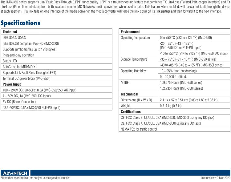 - The IMC-350 series is the most compact media converters. They can extend the 10 and 100Mbps twisted-pair network segments up to 80km over fiber technology. Supporting both 10/100 auto negotiation on the copper port and also 100Mbps full-duplex on the fiber port, the IMC-350 series serves as media and data rate converter. With a variety of model types in terms of its play-n-plug feature and multiple powering options, the IMC-350 series is easy and convenient for any applications. The IMC-350I series is in industrial grade and can operate in wide temperature. The multiple powering options including IEEE802.3af Power-over-Ethernet standard allow IMC-350I series to function as a power device. Its AC adapter and USB connectivity offer an unsurpassed flexibility for a variety of installation needs. The IMC-350 LFPT series supports Link Fault Pass Through (LFPT) functionality. LFPT is a troubleshooting feature that combines TX LinkLoss (Twisted Pair, copper interface) and FX LinkLoss (Fiber, fiber interface) from both the local and remote IMC Networks media converters, when used in pairs. This feature, when enabled, will pass a link fault through the device at each segment. If a link fails on one interface of the media converter, the media converter will force the link down on its link partner and then forward it to the next interface.