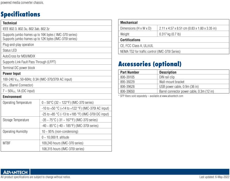 - Industrial grade design that supports an extended operating temperaturerange (IMC-370I series)