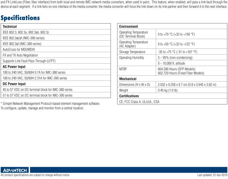 - The IMC-380 and IMC 390 series are compact, multi-port media converters that support both IEEE802.3at and IEEE802.3af PoE standards. These unmanaged, plug-n-play media converters with PoE capability are thus ideal solution for Ethernet networks. Designed with two 10/100/1000Base-T copper UTP ports and SFP or fixed fiber transceiver, 1x9 uplink port for the network connection, the IMC-380 series can power one PD device through standatd CAT5 (or higher version) cable via one copper port while delivering data over the other port. The IMC-390 series in even capable of powering up to 2 PD devices with power budget 60W. The IMC-380 and 390 series support Link Fault Pass Through (LFPT) functionality. LFPT is a troubleshooting feature that combines TX LinkLoss (Twisted Pair, copper interface) and FX LinkLoss (Fiber, fiber interface) from both the local and remote IMC Networks media converters, when used in pairs. This feature, when enabled, will pass a link fault through the device at each segment. If a link fails on one interface of the media converter, the media converter will force the link down on its link partner and then forward it to the next interface.