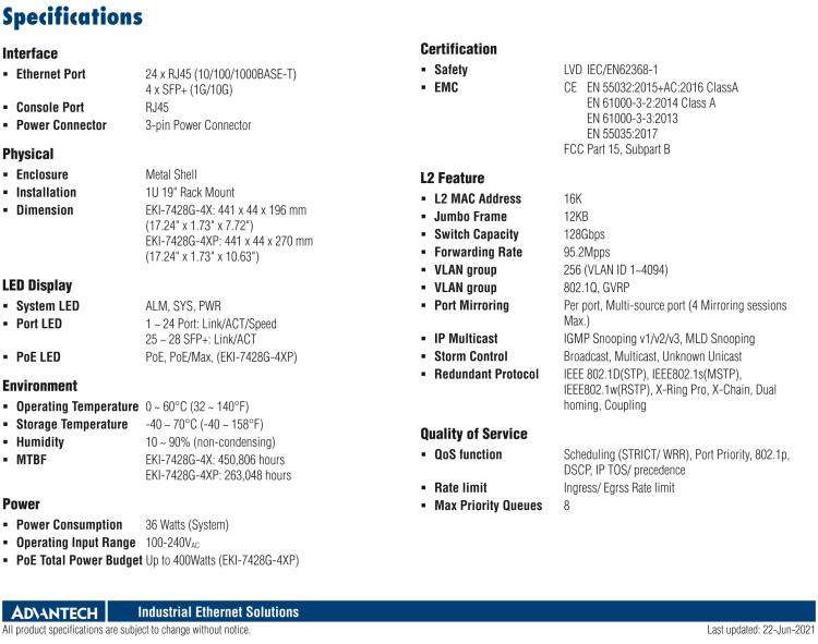 - The EKI-7248G-4X is equipped with 24 Gigabit Ethernet ports plus 4 10G SFP+ ports, supporting up to 60°C wide operating temperature against the harsh environment.