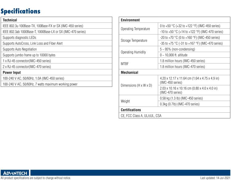 - The IMC-450 and 470 series are standalone media converters with an optional internal power security device that make the connection between copper and fiber cables. It can be installed anywhere a network connection is required. In addition, these media converters feature in automatic link restoration. They also increase the scalability of a network by providing rate conversion ,distance extension and multiple types of fixed fiber connectors or open slots for small form-factor pluggable (SFP) connection. The IMC-450 and 470 support troubleshooting features such as LinkLoss and Fiber Alert which can be enabled/disabled by DIP switches. The diagnostic features allow the network administrator to quickly identify network faults. The IMC-470 series provides two 10/100/1000Mbps copper UTP ports and one fiber port, that is available in an SFP form factor, as well as for fixed-fiber in single-mode and multi-mode. The Link Fault Pass Through (LFPT) functionality allows network operators to determine a fault condition on the interfaces.