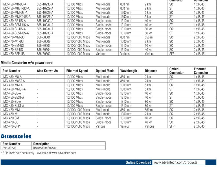 - The IMC-450 and 470 series are standalone media converters with an optional internal power security device that make the connection between copper and fiber cables. It can be installed anywhere a network connection is required. In addition, these media converters feature in automatic link restoration. They also increase the scalability of a network by providing rate conversion ,distance extension and multiple types of fixed fiber connectors or open slots for small form-factor pluggable (SFP) connection. The IMC-450 and 470 support troubleshooting features such as LinkLoss and Fiber Alert which can be enabled/disabled by DIP switches. The diagnostic features allow the network administrator to quickly identify network faults. The IMC-470 series provides two 10/100/1000Mbps copper UTP ports and one fiber port, that is available in an SFP form factor, as well as for fixed-fiber in single-mode and multi-mode. The Link Fault Pass Through (LFPT) functionality allows network operators to determine a fault condition on the interfaces.