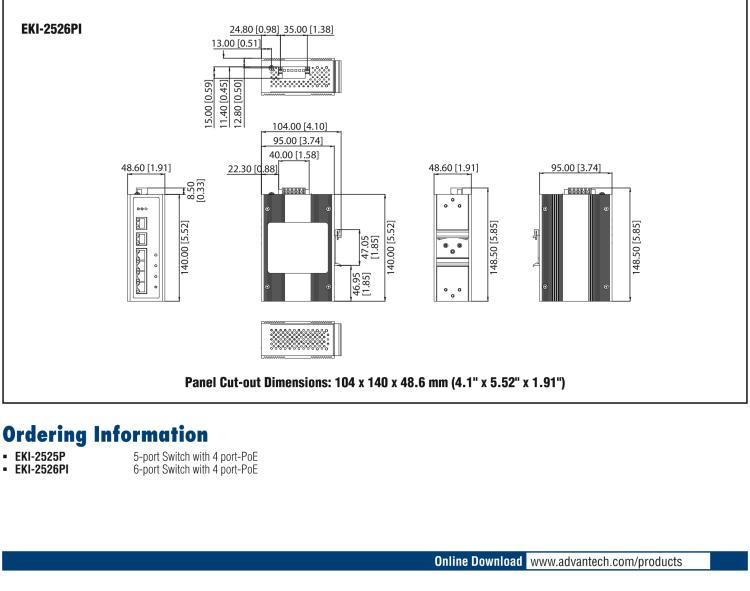 - EKI-2525P是5 端口非网管型PoE (网线供电)工业以太网交换机, EKI-2525PI是6端口的PoE交换机,均支持4 个PSE (供电端设备)接口,每个PoE 端口可支持15.4W 的电源输出。研华PoE 工业以太网交换机可以为IEEE802.3af 标准的受电端设备(PD) 提供电源,免去了额外电源布线的需求。EKI 系列PoE 交换机继承了研华EKI 系列交换机大家庭的优越特质,支持48VDC 冗余电源输入,具有双重保护机制:电源极性反接保护及电流过载保险丝防护。研华EKI系列PoE