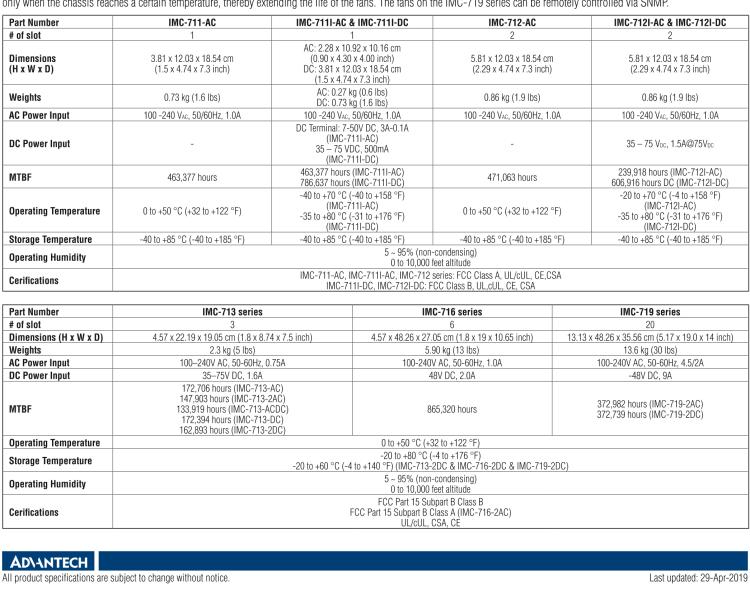 - The IMC-71x series provides conversion of Ethernet-to-fiber and a variety of networking technologies. It enables network operators to drastically reduce the capital and operational expenses bu providing all copper-to-fiber and multi-mode to single-mode conversions and network distance extensions. This modular approach allows network operators to inexpensively change protocols by simply changing the module rather than the entire unit. With AC or DC powering options, it is a economic way to overcome a variety of media and mode conversion challenges. The IMC-713/716/719 series have the highest port density in the industry-- along with a robust design, hot-swappable architecture, SNMP management via iView2, and redundant power supplies for fault tolerance which diverse applications, using a variety of protocols, is required. The temperature controlled fans in the IMC-713/716 chassis activate only when chassis reaches a certain temperature, thereby extending the life of the fans. The fans on the IMC-719 series can even be remotely controlled via SNMP.