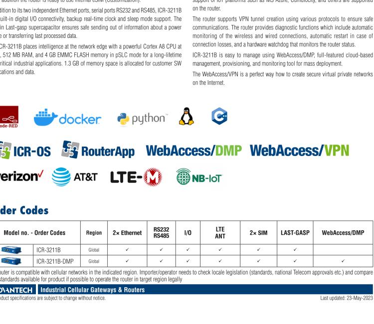 - ICR-3211B is an industrial cellular gateway intended for the North American (NAM) and European (EMEA) markets. The primary purpose of this router is its use in the Category M1 (LTE-M) as well as Narrowband Internet of Things (NB-IoT) services on the cellular LTE network.