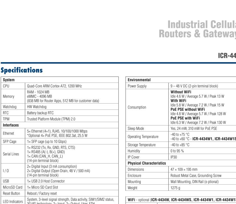 - 5× Gigabit Ethernet, 4× PoE+ PSE (PoE use is limited – see the ICR-4434 user manual), Dual-Band WiFi