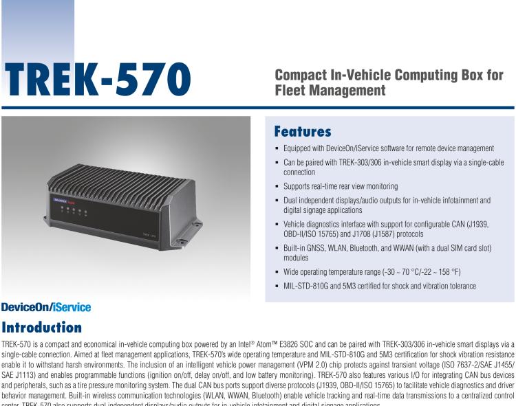 - MicrosoftInternetExplorer402DocumentNotSpecified7.8 磅Normal0 TREK-570是一款紧凑经济型的车载设备,英特尔 Atom E3826 SOC授权计算箱,主要用于车队管理市场。它可以在极端环境中工作,具有宽泛的工作温度范围(-30至70°C)和通过MIL-STD-810G和5M3标准的抗冲击/振动功能。其专用电源保护(ISO 7637-2 / SAE J1455 A类/ SAE J1113)和智能车辆电源管理(例如点火延迟开/关,低电量监控)可防止系统受异常电噪声和电涌影响,防止瞬态车辆电源损坏。 TREK-570结合各种I / O连接器,可连接到TPMS(轮胎压力监测系统),后视摄像头(用于停车监控)和CAN总线设备等设备。它具有双CAN总线端口,并支持车辆诊断和司机行为管理的车辆协议(如J1939,OBD-II / ISO 15765)。内置无线通信(WWAN,WLAN,BT)使TREK-570能够将重要的驾驶员/车辆/位置/货物信息发回控制中心。