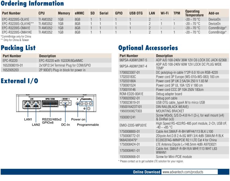 - 研华EPC-R3220是基于TI AM3352 Arm Cortex-A8的边缘智能网关。硬件设计遵循严格的工业标准,可宽压,宽温工作; 软件服务支持方面,研华提供三个等级的服务: 第一等级, 基础的软件服务,包括提供Linux的BSP/SDK等;第二等级, 提供用研华的边缘智能软件 CommBridge APP,用户通过简单配置就可以进行数据的采集,数据的过滤,并直接连接到公有云或私有云做数据的分析处理;第三等级, 边缘智能软件定制服务,包括根据私有协议做数据采集,调整网关端数据过滤的规则,与特有协议的云对接等。