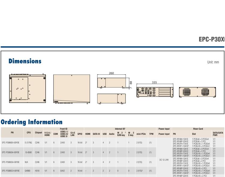 - 研华EPC-P3086是一款行业专用的嵌入式工控机,尺寸为335x260x88mm。适配Intel® 第8/9代 Core™ i 系列处理器和H310芯片组。可扩展多种PCIe/PCI方案,最多可支持4张扩展卡。采用12V DC-IN供电,超薄设计整机,拥有丰富的接口。工业级品质,稳定可靠,支持上架,是理想的工业、AI等行业嵌入式工控机解决方案。