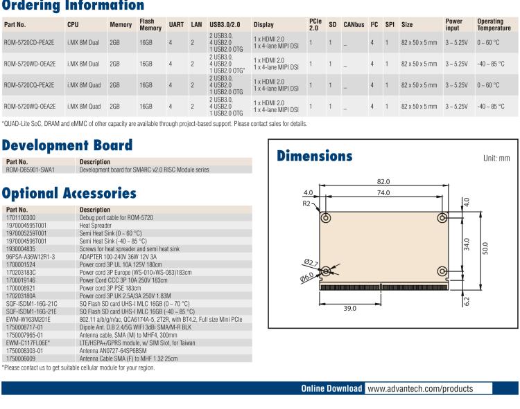 - 研华 ROM-5720 SMARC 2.0核心板采用恩智浦NXP i.MX 8M处理器,支持2/4* Coretex A53+1* Coretex M4实时运算内核及Vivante GC7000 Lite 3D图形引擎。支持两组USB3.0信号,两个千兆以太网,两个MIPI-CSI, PCI Express, HDMI2.0 4K显示。可应用于轨道交通及航空影音娱乐系统、KIOSK、医疗、机器人等领域。