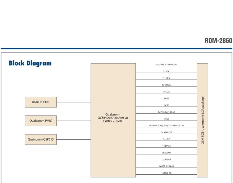 - ROM-2860 OSM 1.1 Computer-on-Module is powered by Qualcomm QCS6490/5430 SoC which includes up to Arm v8 Cortex® in combination with Andreo GPU 643 and Andreo VPU 633 graphics engine. It provides PCIe, USB 3.2, GbE, MIPI-CSI, I2C, SPI, GPIO and eDP, DP, MIPI-DSI display for embedded applications.