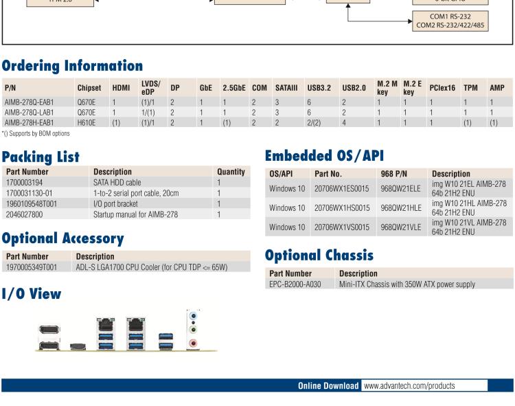 - 研华AIMB-278是一款Mini-ITX版型的工业主板。搭载Intel 第12代 Core i/奔腾系列处理器和Q670E/R680E/H610E芯片组。支持独立四重显示,功能接口丰富。AIMB-278满足各项严苛测试,品质稳定可靠,是医疗影像、人工智能、AI视频处理等高性能行业的解决方案。