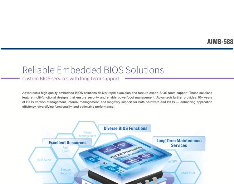 - 研华AIMB-588是一款MicroATX主板。搭载Intel 第12代 Core i 系列处理器和Q670E/R680E/H610E芯片组。性能可达服务器级别。独立四重屏幕显示和PCIe x16 Gen5,具备出色图像处理能力和运算性能。4个GbE LAN,最高可达2.5GbE,为高清视频和图像采集提供了更为专业的解决方案。丰富的扩展能力,灵活设计,强调功能性。在对实时处理和图形处理能力有要求的使用场景里,AIMB-588为高度适应性的解决方案。