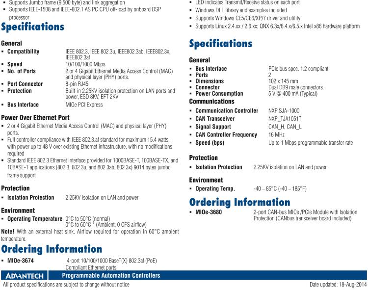 研华MIOE-3680 2路隔离CAN Bus扩展模块