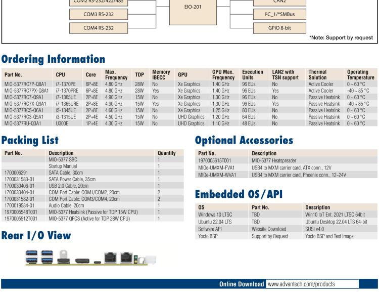 - MIO-5377搭载全新的13代Intel Core平台,支持全新DDR5内存,提供USB4.0高速接口,提供2XCAN bus,并支持5G模块,性能升级,可广泛应用在医疗、机器视觉、AI等行业中。