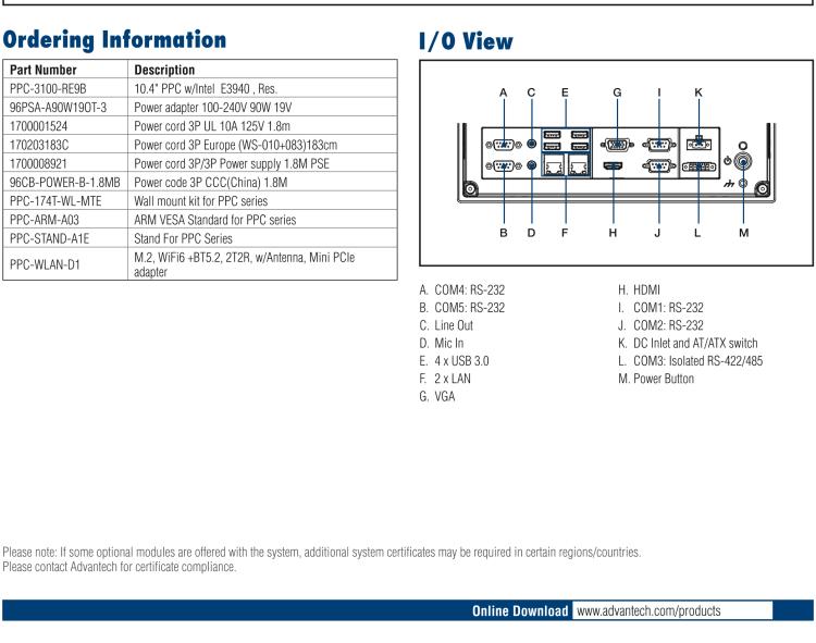 - PPC-3100是一款10.4" 无风扇平板电脑, 采用高性能Intel® Atom™ E3940 四核处理器, 支持宽电压输入 (9 ~ 32VDC), 集高性能与高可靠性于一身。另外, PPC-3100丰富的I/O接口包括4个COM, 4个USB3.0, 1个独立RS- 422/485 和英特尔 2.5GbE 以太网,使设备连接和集成变得简单容易。