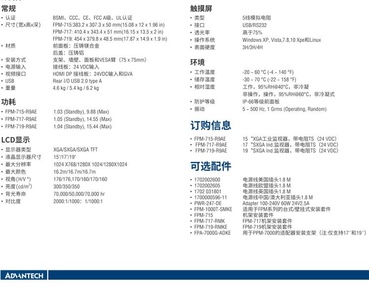 - Equipped with durable 5-wire resistive touchscreen and an IP66-rated front bezel. Moreover, FPM-700 series support a wide operating temperature range (-20 ~ 60 °C/-4 ~ 140 °F) and various mount options to make these monitors ideal factory and machine automation display applications.