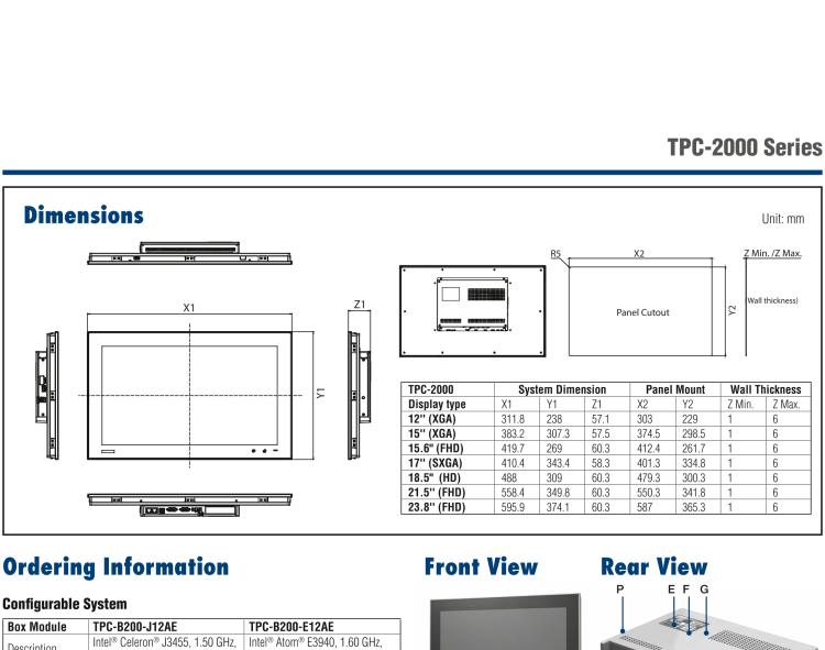 - TPC-2000系列是瘦客户端系列中的一款模组化产品。凭借工业级LCD和低功耗嵌入式Intel®Celeron®J34551.50GHz处理器和4GB DDR3L SO-DIMM,它在紧凑的无风扇系统中提供了足够的显示区域和理想的计算性能。模组化设计进一步为用户提供了扩展和配置系统的灵活性,并且简化了维护和升级。前面板IP66适用于各种用户环境,玻璃表面达到6H或以上的硬度,电容式多点触控或5线电阻式触摸屏,外框采用压铸铝合金材质,可提供坚固可靠的系统外壳。即用型的Wi-Fi和NFC天线集成在前面板中(选配),具有良好接收和灵敏度。
