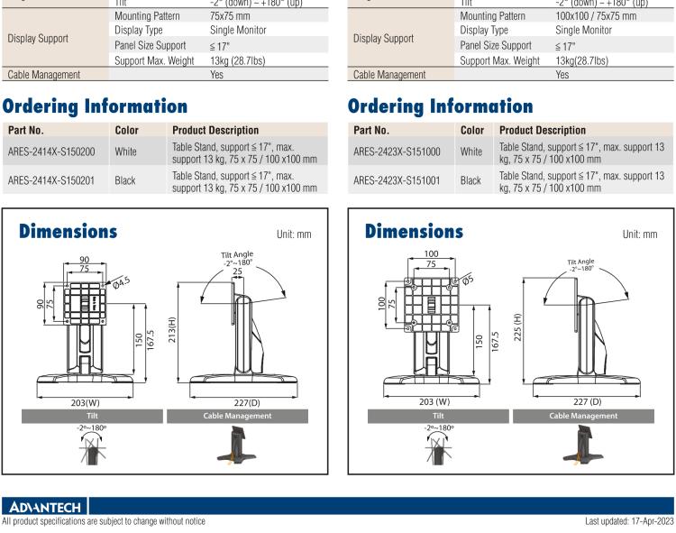研华ARES-2423S ARES-2423S is a height-adjusting desk stand compatible with 75x75/100x100 mm VESA patterns. It can tilt -5° (down) ~ +20° (up) and screens up to 34".
