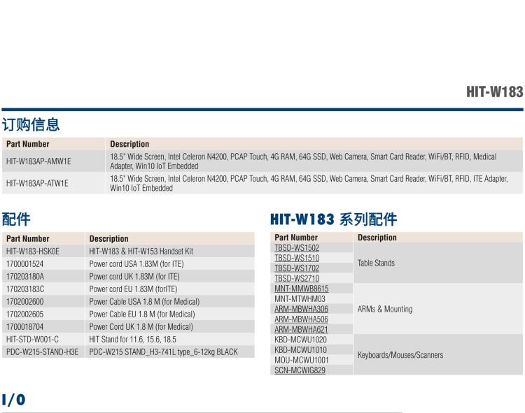 - HIT-W183是HIT系列的创新产品,采用43mm超薄机身,USB 3.0,5百万像素摄像头和双独立以太网,可让医院分别管理内部和外部网络。HIT-W183同时配备专业音频编解码 器支持背景音降造功能,以保证呼叫护士电台的音质。而护士呼叫按钮和LED指示灯可以轻松连接到医院现有的护士呼叫系统,即使在系统关闭时也可以独立运行。HIT- W183是医院应用的理想选择,如床边信息终端,IP护士呼叫站和治疗中心。同时,它也可以用作医疗设备的HMI界面。