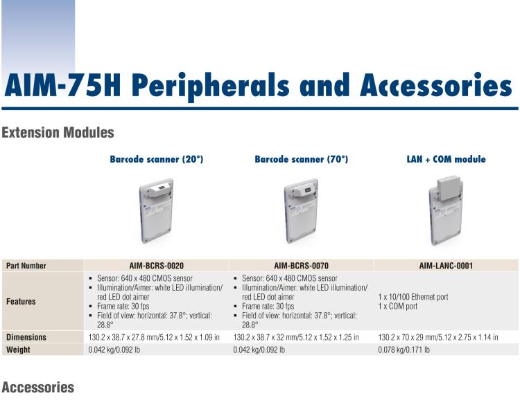 - 丰富可选外设,包括1D/2D 条码扫描模块, LAN+COM 模块, 和 UHF RFID 模块