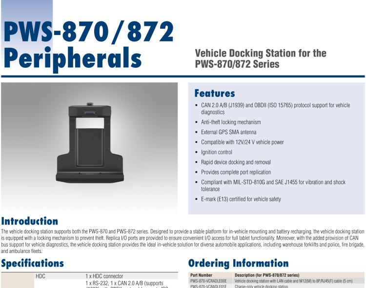 - PWS-872为一台工业级别平板电脑,搭载第七代Intel® Core™ i3/i5/i7/Celeron® 处理器,10.1寸高清高亮WUXGA LED 屏幕支持PCAP多点触控。mSATA SATA III SSD存储、丰富I/O端口和Wi-Fi(802.11 a/b/g/n/ac),NFC,3G/4G LTE,蓝芽4.1等多样通讯功能。前后摄像头(2M & 8M)和NFC阅读器方便资料採集。高清高亮屏幕、阳光下可读功能支持户外作业,热插拔电池设计提供移动设备长达11小时的不间断供电,为一专为严苛环境设计,坚固耐用,通过 MIL-STD-810G,IP65等级防水防尘及4ft跌落测试。此外,PWS-872可集成多样配件,例如:车载底座、多电池充电座、保护壳等,并支持多种I/O扩充,可运用于不同的场域。