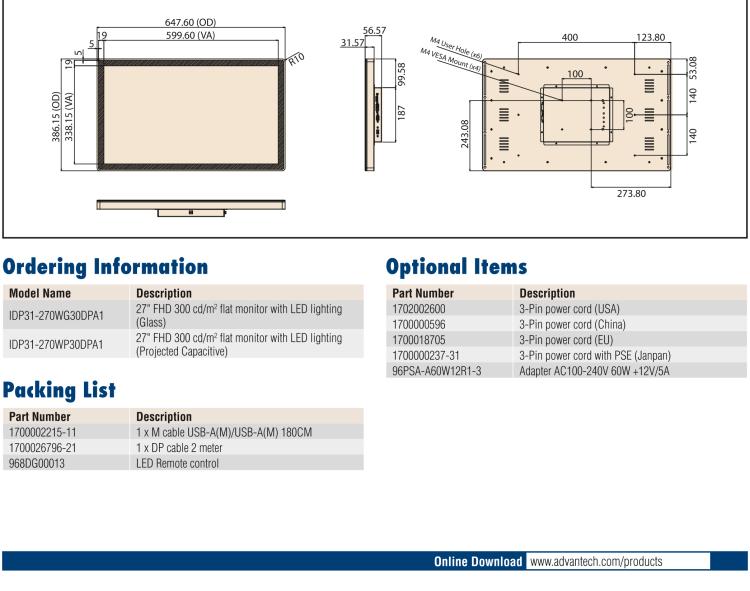 - IDP31-270W系列提供了2种类型的功能,普通玻璃屏幕和投射式电容触控屏。它还具有宽广的视角,支持多彩的画面和标准的VESA安装(100 x 100毫米)设计。