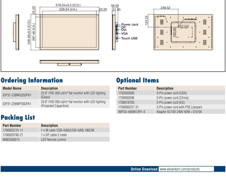 - IDP31-238W系列提供了2种类型的功能,普通玻璃屏幕和投射式电容触控屏。它还具有宽广的视角,支持丰富多彩的图像和标准的VESA安装(100 x 100毫米)设计。