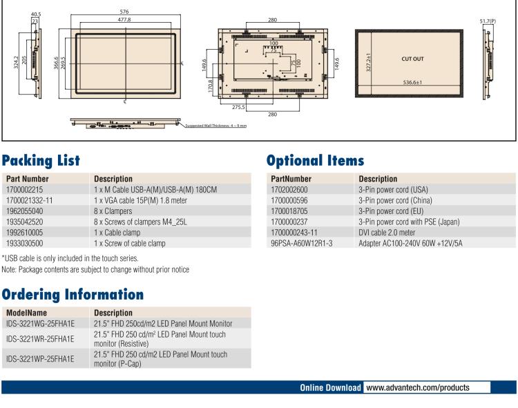 - 研华 IDS-3221W 嵌入式面板安装显示器系列产品允许用户灵活选择 LCD、触摸屏、信号接口和机箱安装方式。该系列产品采用标准集成框架设计,可支持便捷的前部安装和 VESA 安装,因此可灵活支持各种不同应用。