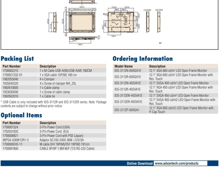 - 研华IDS-3112开放式显示器系列采用超薄设计,支持1024 x 768和800 x 600像素的12.1" TFT LCD显示屏,其工作温度范围为-20 ~ 60℃且支持选配电阻式触摸屏。该系列产品支持后部和VESA安装方式,是各种嵌入式应用的理想选择。
