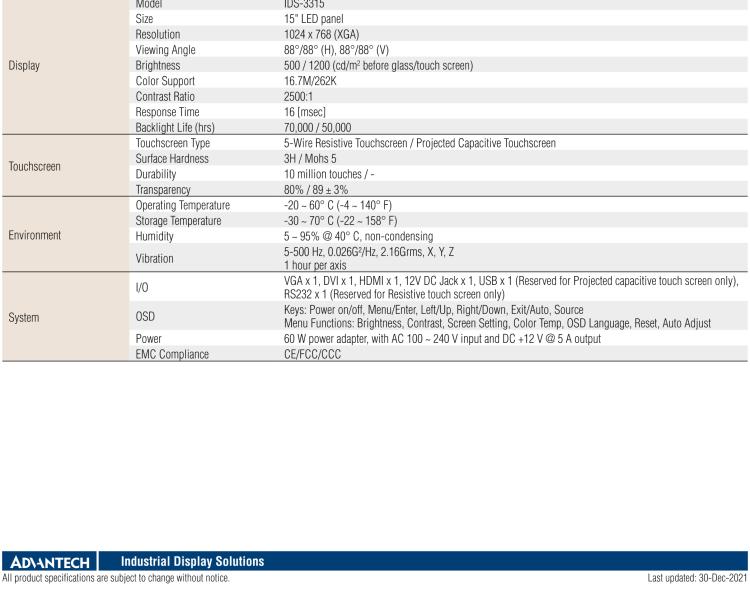 - 研华 IDS-3315 前置 IP65 显示器系列提供防水防尘设计,支持 15" 1024 x 768 像素 TFT LCD 屏幕,工作温度范围为 -20~60℃,触摸屏可按需选配。该系列支持后部和 VESA 安装,是不同环境中各种嵌入式应用的理想选择。