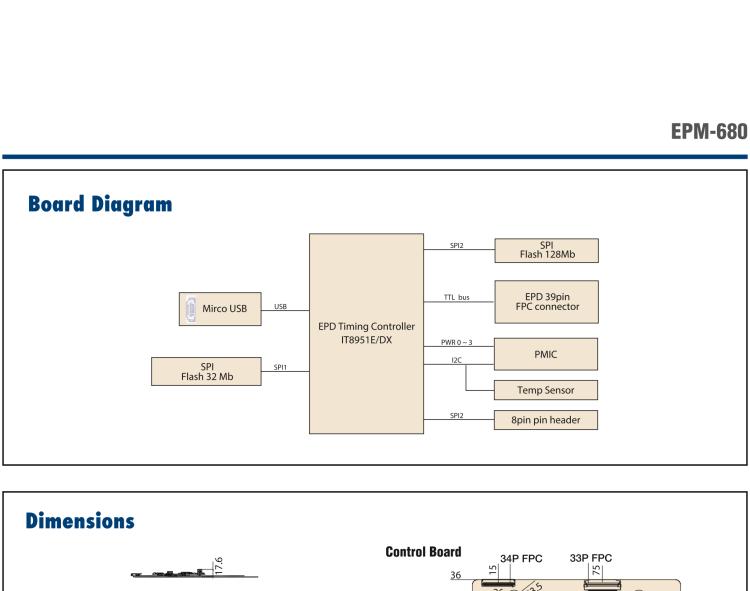 EPM-660、EPM-662支持13.3" 寸电子纸驱动,并提供USB接口进行数据传输。客户可采用该主板设计自己的电子纸设备,以适应不同的应用。