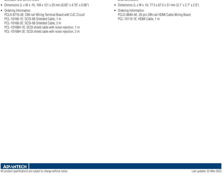 PCLD-8710螺丝接线端子板多功能DAS卡的20脚平板电缆连接器或DB-37连接器,如PCL-818系列卡板提供了一个方便可靠的配线.另外,PCLD-8710设计为可与68脚的SCSI-II连接,如PCI-1710/1710HG/ 1711/1731卡板