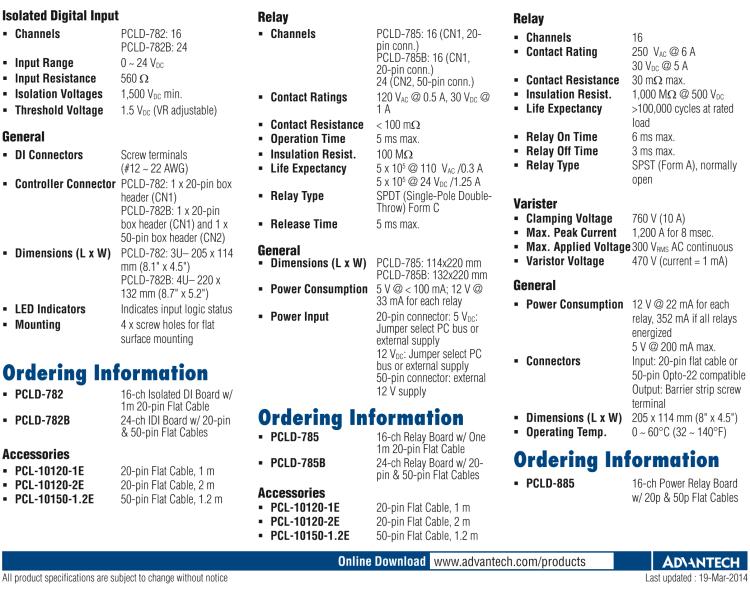 - PCLD-782和PCLD-782B是两款光隔离数字量输入板.这两款输入板的所有输入通道上都提供了高电压(>1500VDC)光隔离保护.PCLD-782通过一个PC-LabCard都带有的标准20芯扁平电缆接口,提供了16路数字量输入通道.PCLD-782B根据您使用的接口,可提供16路或24路数字量输入通道.PCLD-782B带有一个20脚接口,用来提供16路输入通道.PCLD-782B同时还带有一个50脚Optp-22接口,用来提供24路输入通道.