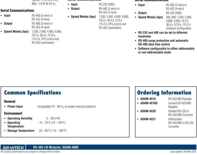 - 大多数工业计算机系统都带有标准的RS-232的端口。虽然RS-232得到了普遍的使用,但它的传输速率、传输距离及网络容量还是有一定的限制。RS-422和RS-485标准通过将数据及控制信号使用差分信号进行传送,克服了RS-232的不足。ADAM-4520/4522隔离转换器能够让您在早期的RS-232系统上充分利用RS-422和RS-485的优点。它能够将RS-232信号透明转换为RS-422和RS-485信号。您无须改动PC上的任何硬件及软件。ADAM-4510S中继器能够对已有信号进行放大或增强,使信号可以传输更远的距离。它能够将通讯距离再延长1200米(4000英尺),或再增加32个连接节点。