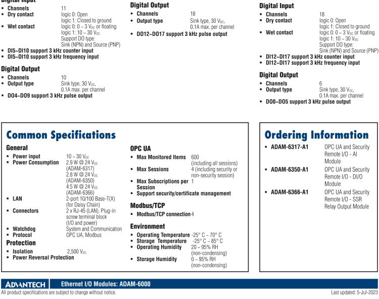 - 研华ADAM-6300系列是一款创新的OPC UA I/O模块,采用Modbus协议,无需网关即可与SCADA和云连接。此外,通过OPC UA和内置安全IC,数据在整个OT和IT级别都得到了高度保护。