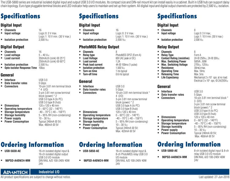 - USB-5800 系列 是 工业 隔离 式 数字 输入 和 输出 USB 3.0 I/ O 模 块。其紧凑的尺寸和DIN导轨安装套件可以轻松安装在机柜中。内置 USB 集线器可以支持菊花链拓扑。欧式可插拔接线端子和 LED 指示灯可帮助用户维护和设置其系统。所有数字输入和输出通道均受 2,500 VDC 隔离保护。