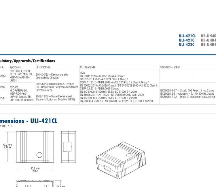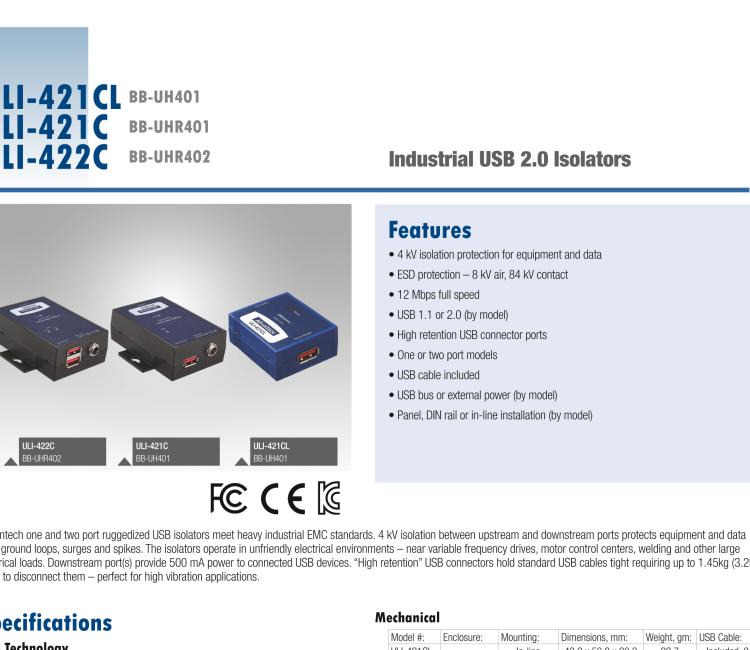 - UHR402 是一个坚固的双端口隔离器。经过设计和测试,满足重型工业 EMC 标准。高稳定性 USB 接头,可收紧标准 USB 线缆,适合高度振动的应用 - 需要高达 3.2 lbs 的力量才能断开连接。在上行和下行 USB 端口之间提供 4 kV 隔离功能,保护昂贵的设备免受危险接地回路的损坏,并帮助确保数据完整性。